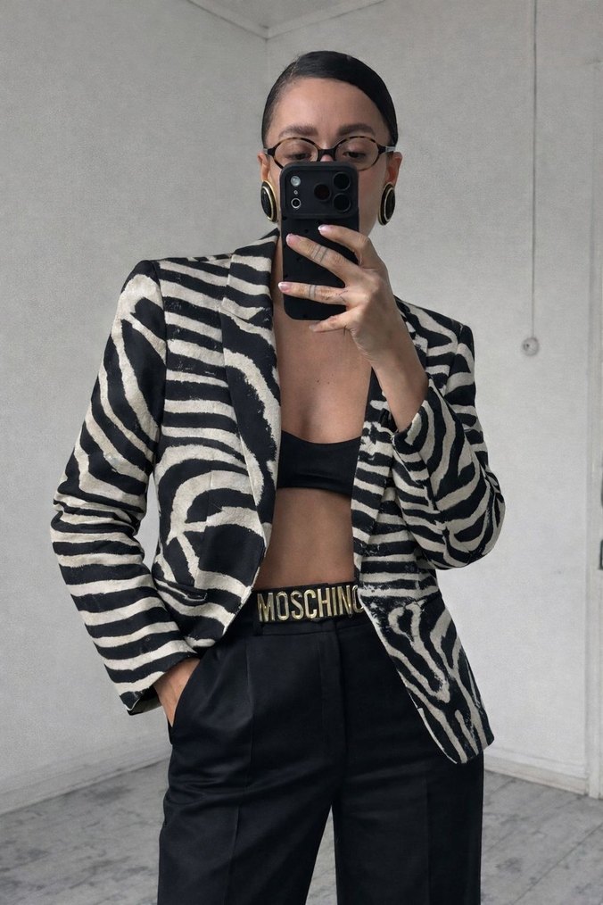 Kadınlar için zebra desenli, kısa kesim, oturan blazer ceket. Notlu yaka, uzun kollu ve tokalı detaylara sahip. Sentetik kumaştan yapılmış, günlük sokak stili için uygun.