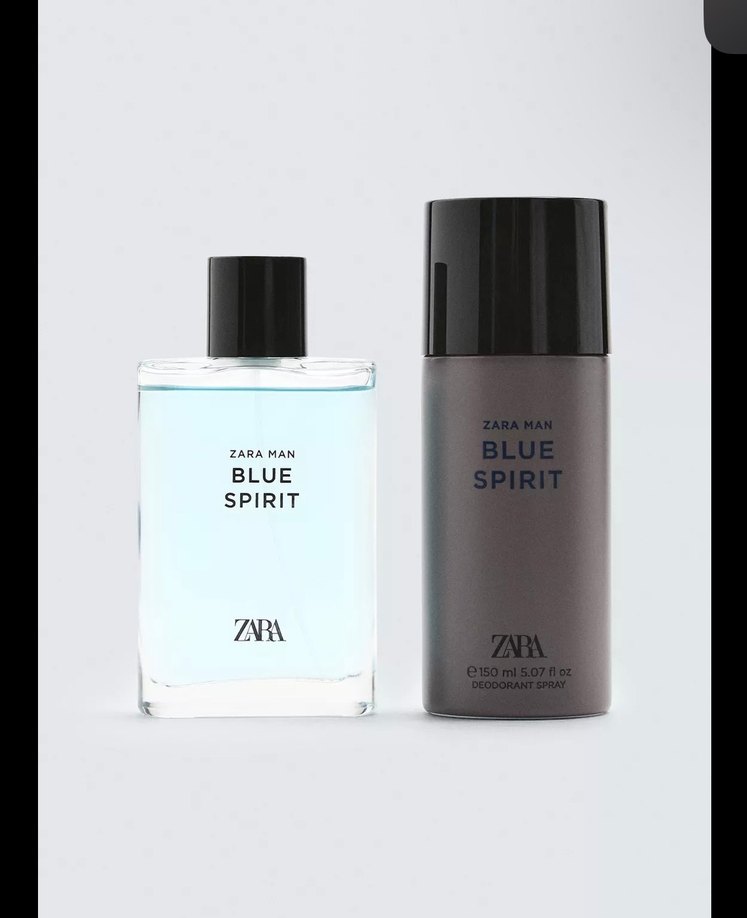 Zara Blue Spirit erkek parfüm seti, minimalist ve çağdaş tasarımla, koyu mavi tonlarda eau de toilette ve deodorant sprey içerir.