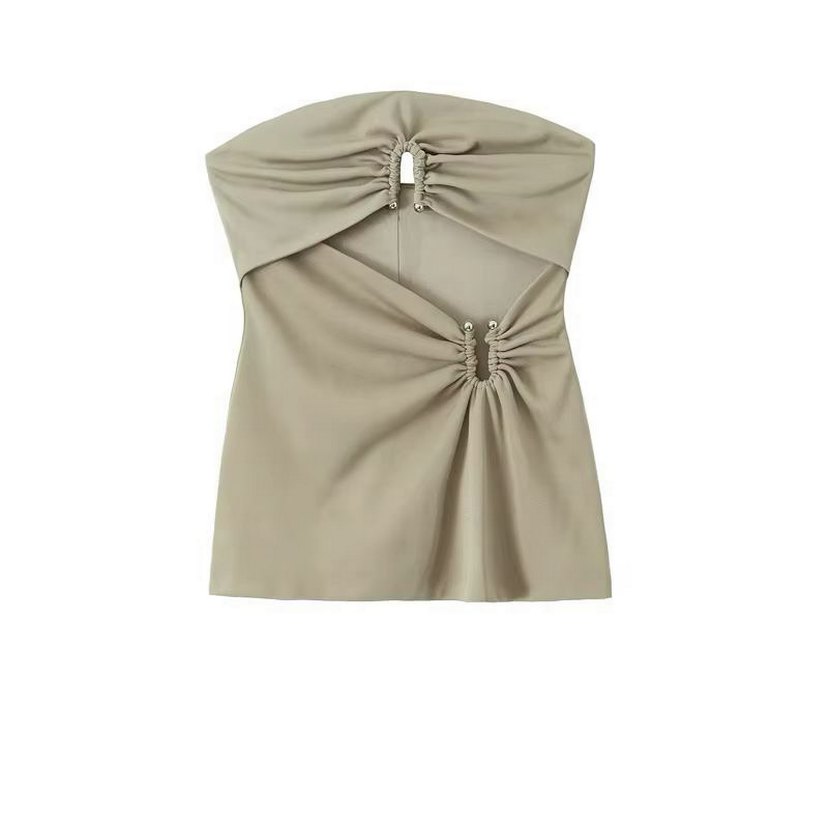 Kolsuz, straplez bej keten bluz, drapeli detaylı ve dar kesim mini boyda, minimalist ve çağdaş tarzda. Günlük kullanıma uygun.