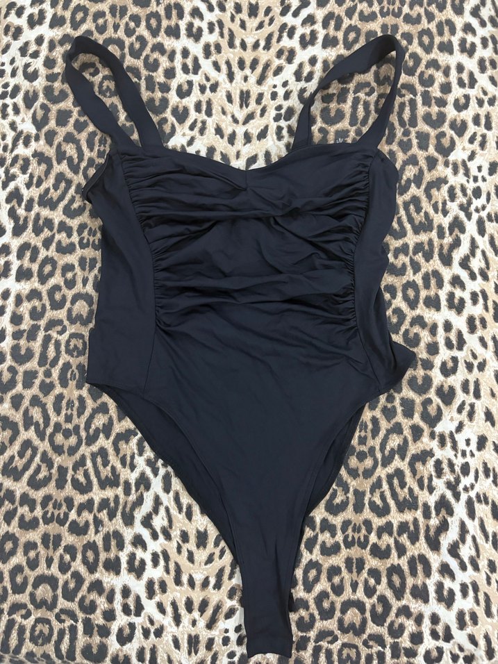 Siyah renkli, strappy askılı ve büzgülü detaylı, athleisure esintili gotik tarzda, vücuda oturan kadın mayo.