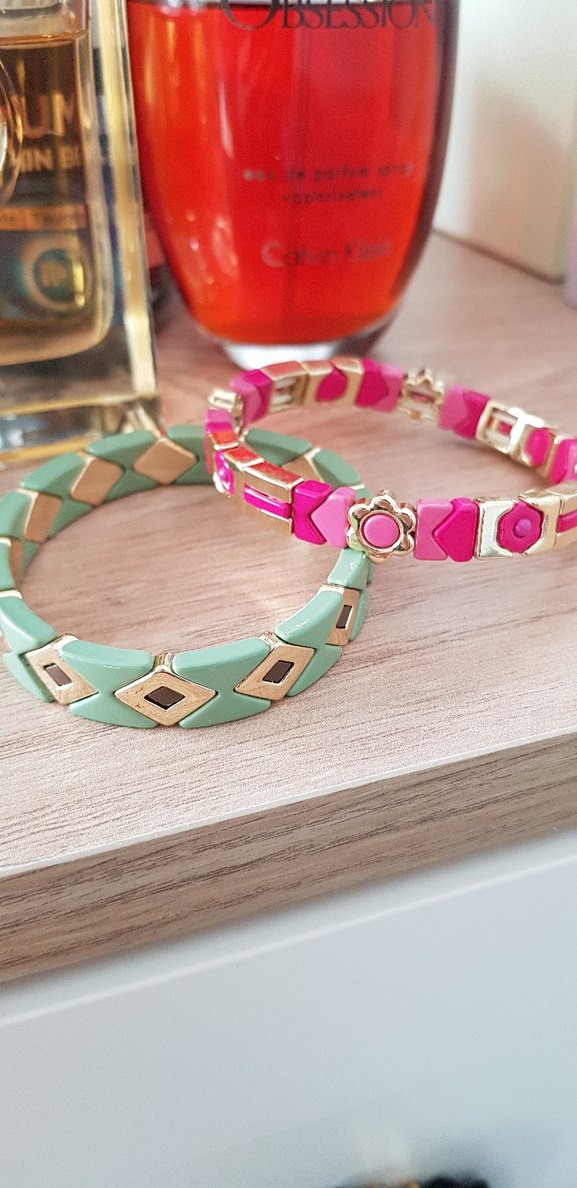 Turkuaz ve pembe desenli, boncuklu renkli bileklikler, günlük kullanım için bohem tarzda. marka temsili #zara