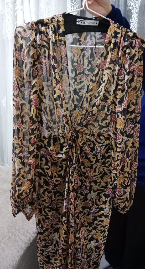 Bohem tarzda, V yakalı, uzun kollu, bol kesim ve çok renkli koyu çiçek desenli uzun elbise. Günlük kullanım için uygundur.