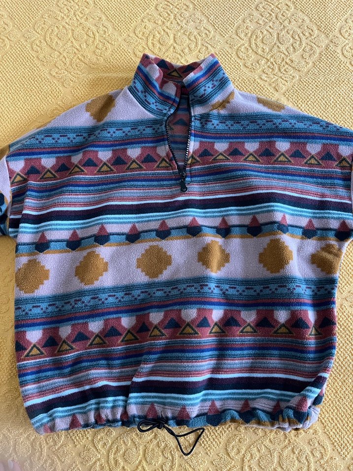 Marka temsilidir için bohem tarzda, yüksek yakalı ve uzun kollu, bol kesimli çok renkli pastel desenli triko sweatshirt. Alt kısmında ayarlanabilir bağcık bulunur. Günlük kullanıma uygundur.