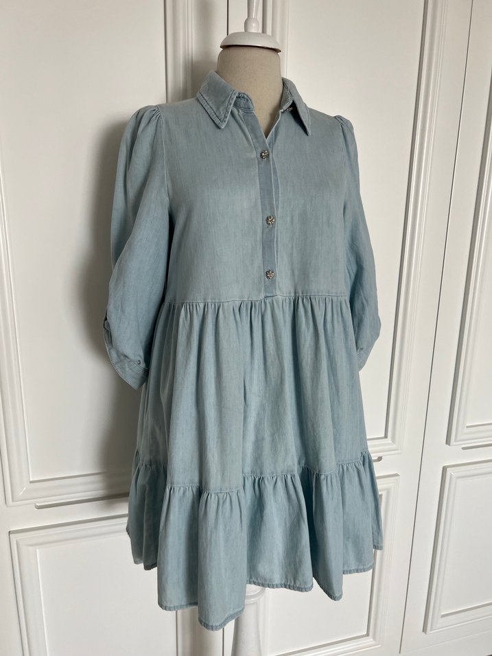 Pastel mavi renkte, yakalı ve uzun kollu, bol kesim uzun denim elbise. Günlük kullanıma uygun, zahmetsiz şıklık sunar.
