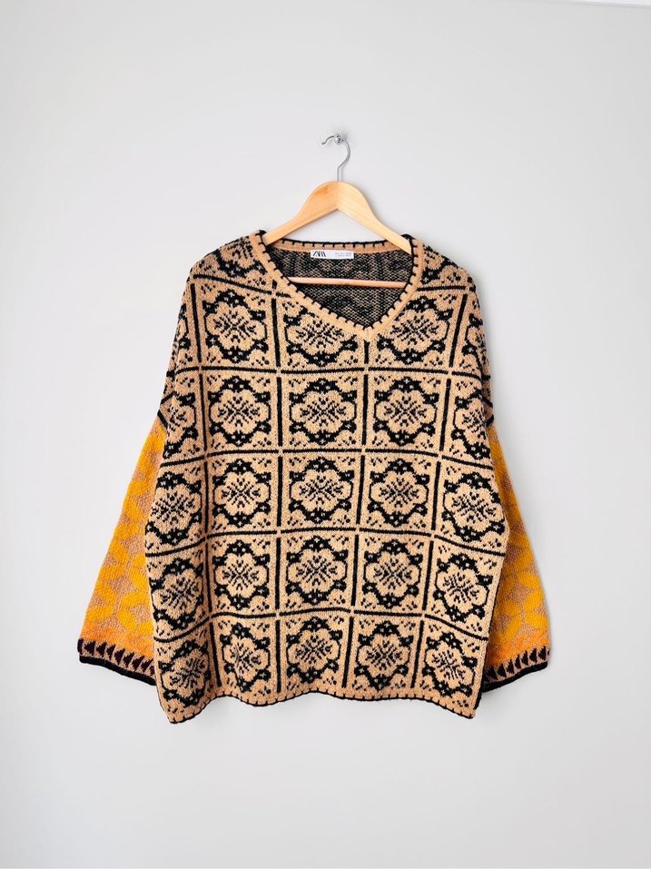 Bohem tarzda, renkli desenli örgü kadın kazak, uzun kollu ve bol kesim, günlük kullanıma uygun. ✨