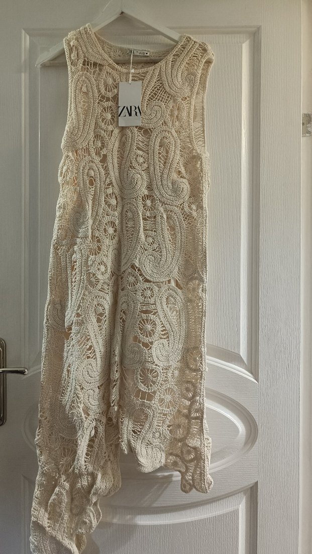 Zara işlemeli, yüksek yakalı ve kolsuz uzun beyaz elbise, yumuşak triko kumaştan üretilmiştir. Bohem tarzda, rahat ve bol kesimdir.