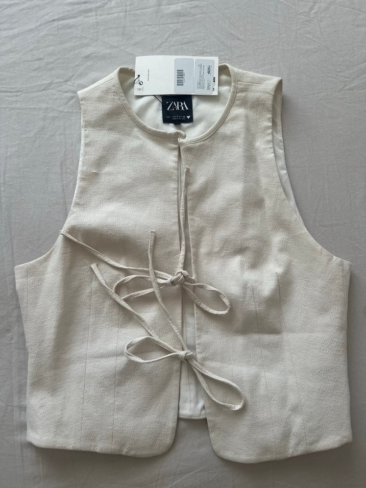 kolsuz, halter yaka ve bağcıklı beyaz yelek. Günlük kullanım için minimalist ve rahat kesim.