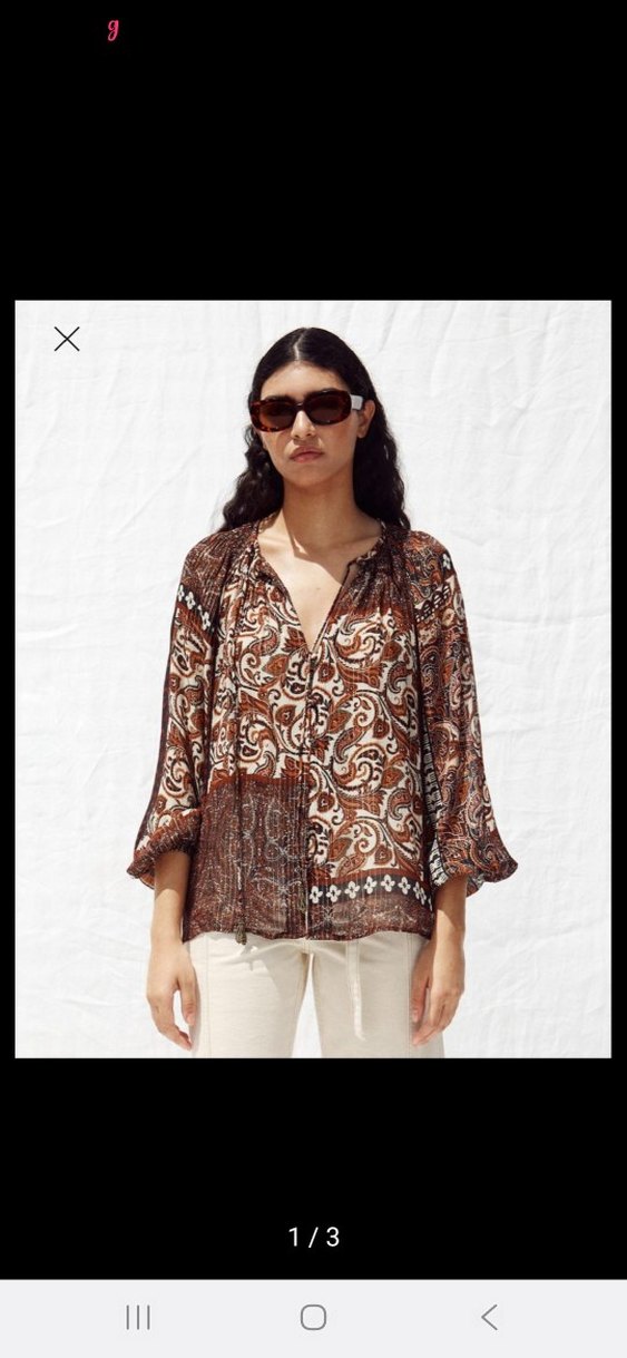 Bu bol kesim kadın gömleği, uzun kollu ve V yaka olup düğmeli öne sahiptir. Kısa boyda, ipeksi kumaşta koyu kahverengi batik desenlidir, bohem tarzına uygundur. Günlük kullanım için idealdir. M beden etiketi üzerinde sıfır