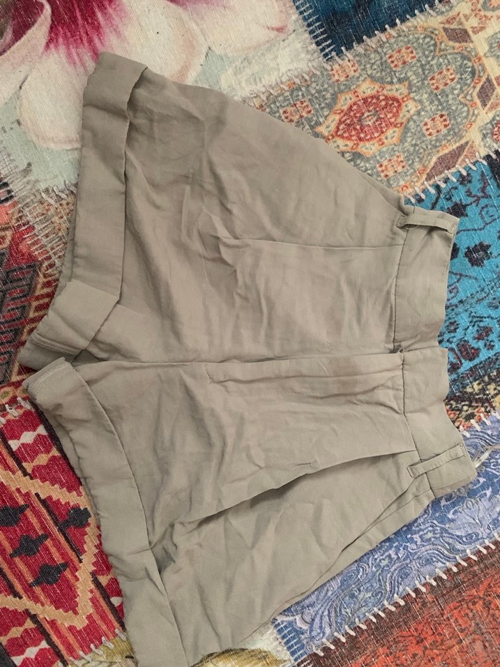 Bohem tarzı, yüksek bel, keten kumaştan bej renkli, bol kesim ve drapeli kısa şort. Günlük kullanım için uygundur.(ürün ütülenmediği için kıvrışık duruyor)