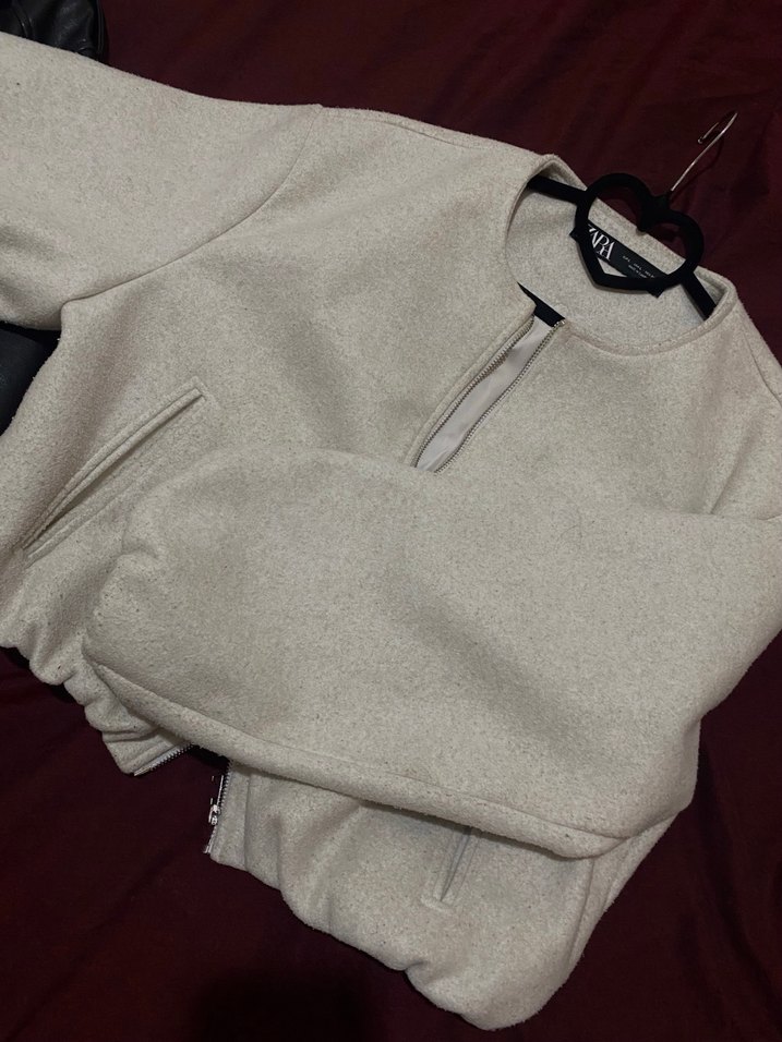 Bej renkte, kısa boylu, fermuarlı ve yuvarlak yakalı kadın sweatshirtü. Yumuşak ve rahat kumaştan, bol kesim ve uzun kollu, gündelik sokak stiline uygun.