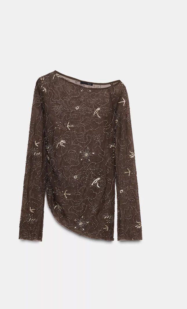 etiketli Kahverengi, uzun kollu, tekne yaka ve bol kesim. İpek gibi kumaş ve işlemeli dantel detaylara sahip, çağdaş Paris tarzını yansıtır. Günlük kullanım için uygun.