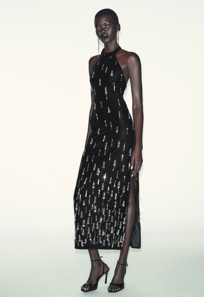 Zara Boncuk İşlemeli Siyah Uzun Elbise