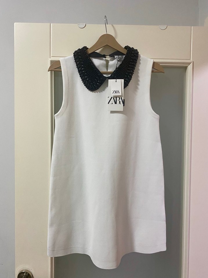 ZARA boncuklu bebe Yakalı Beyaz Mini Kolsuz Elbise