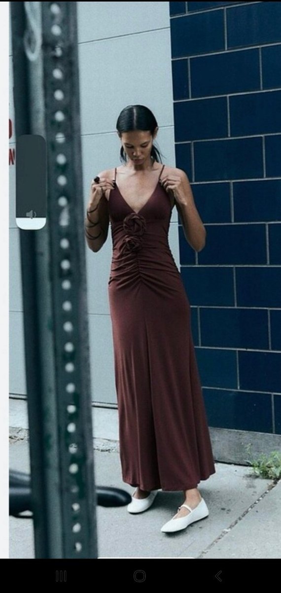 Bordo uzun elbise, ince askılı ve V yaka detaylıdır. Önde drapeli ve gül detayı bulunmaktadır, etiketli çok güzel bi elbise