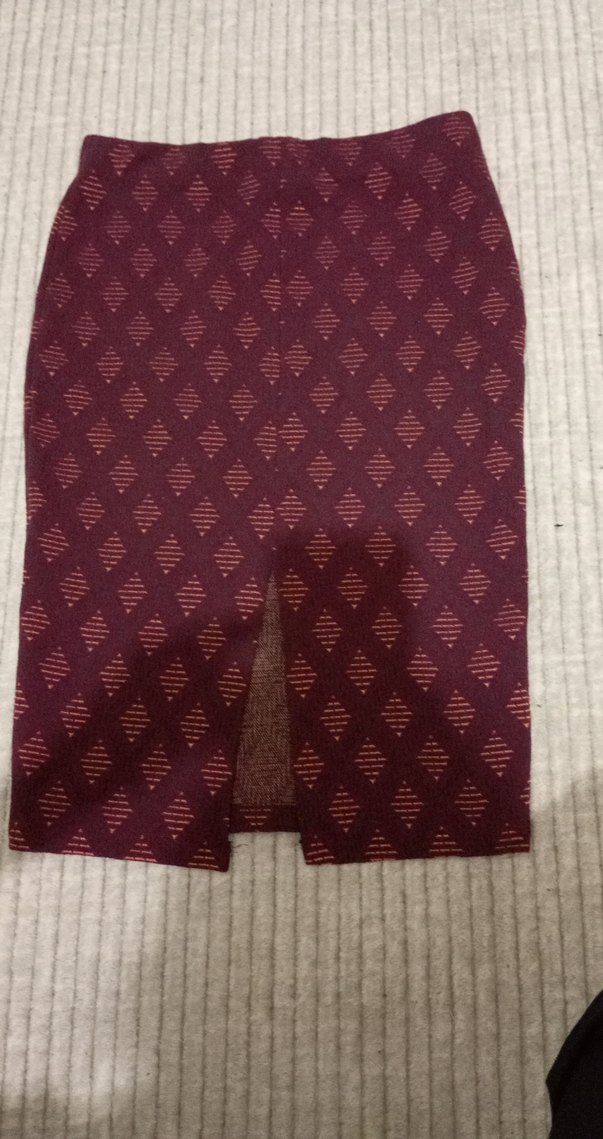 Sentetik kumaştan yapılmış, yırtmaçlı ve desenli bordo uzun kalem etek, bohem tarzı için uygundur.