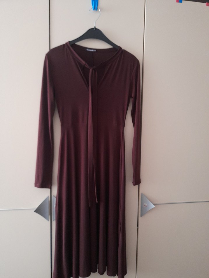 Bordo renkli, uzun kollu ve V yakalı bu uzun elbise, ince ve dökümlü dokusu ile minimalist ve klasik zarafet tarzına uygundur. Günlük kullanıma uygun. S beden.