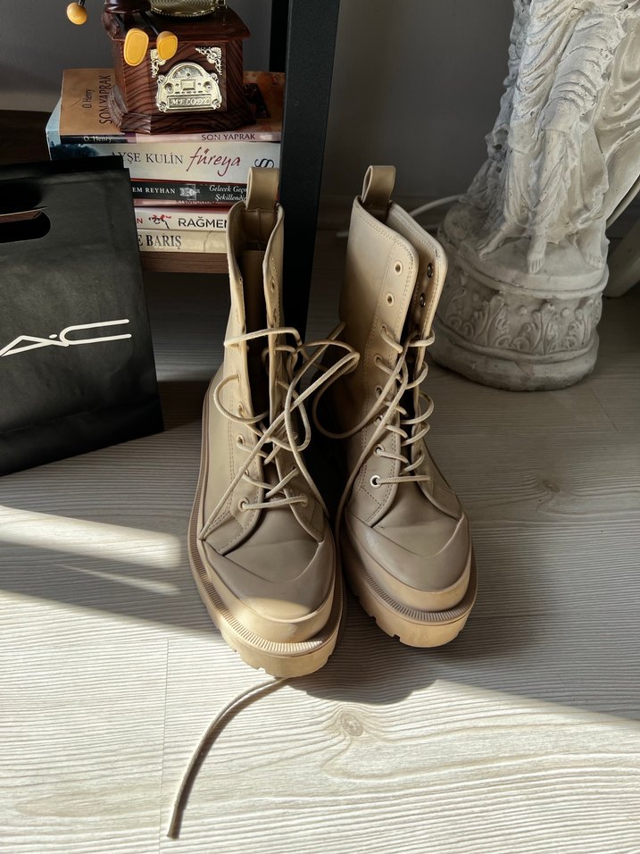 Bej renkte, lastik malzemeden yapılmış, stiletto topuklu kadın botları. Normcore tarzıyla günlük kullanıma uygun, desen içermeyen rahat ve şık bir model.