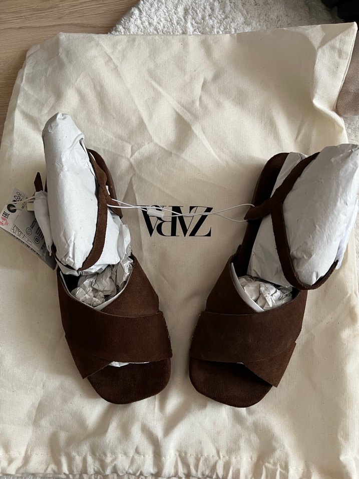 Zara bu Kahverengi Süet Dolgu Topuklu Kadın Sandalet