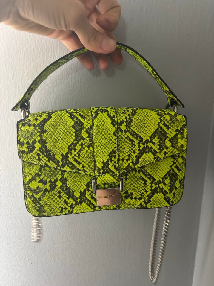 Sarı yılan desenli deri çanta, zincir detaylı, sokak stili için uygun.