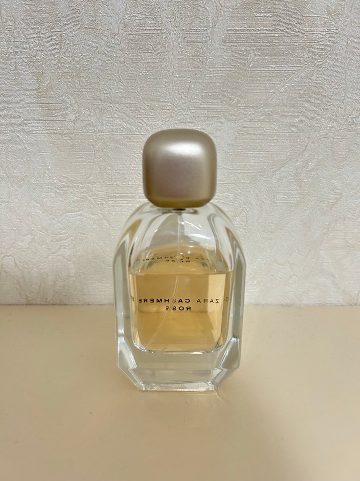 Zara Cashmere Rose kadın parfümü, mat altın kapaklı şeffaf, keskin cam şişede yumuşak ve zarif koku sunar.