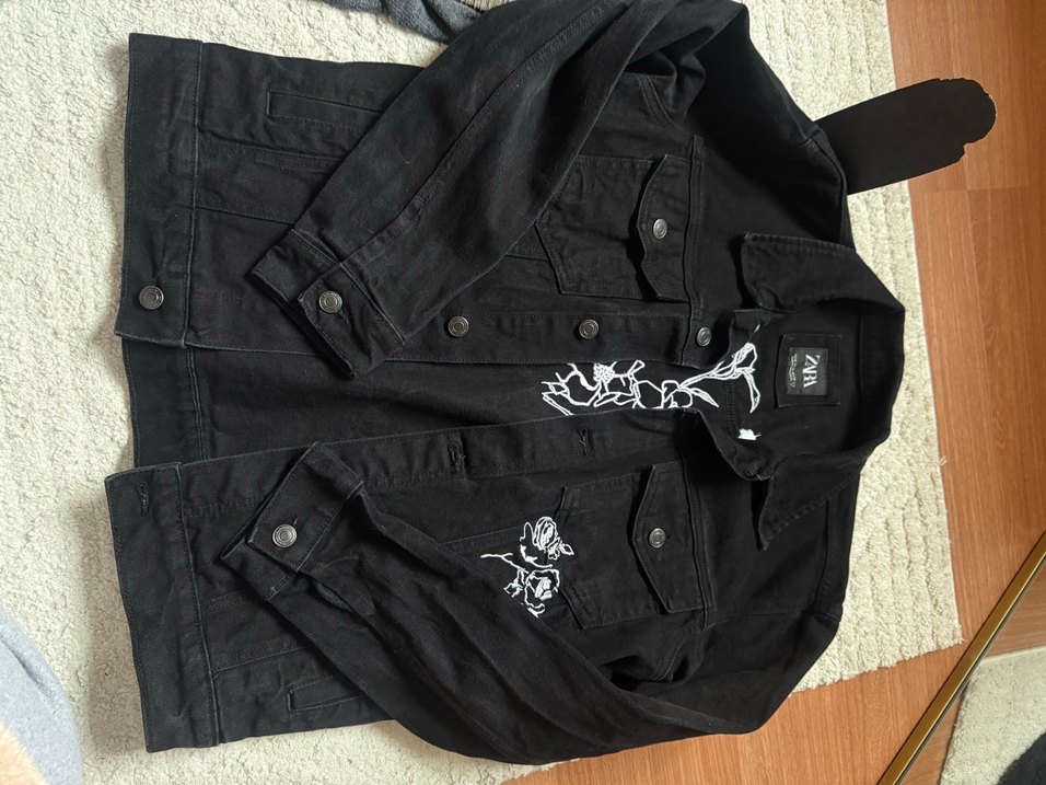 Uzun kollu, düğmeli siyah denim ceket. Nakış detaylı, notched yaka ve bol kesimli, grunge punk tarzını yansıtır.
