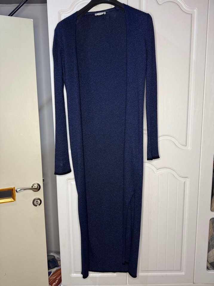 Zara lacivert parıltılı yandan yırtmaçlı uzun ceket