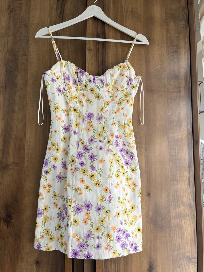 Askılı, straplez ve oturan kesime sahip, pastel çiçek desenli bohem mini elbise. Drapeli tasarımı ile romantik akşamlar için uygun. Etiketi çıkarıldı kullanılmadı, dar kalıp