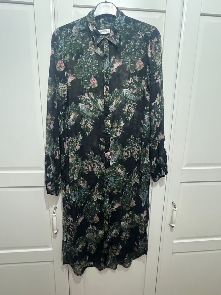 Çiçek desenli, uzun kollu ve bol kesim elbise. Yakalı ve düğmeli önü ile bohem tarzını yansıtan sentetik kumaştan üretilmiştir.