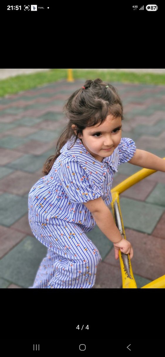 Pamuklu, bol kesim kız bluzu, düğmeli, yakalı ve kısa kolludur. Pastel mavi çizgili ve çiçekli desenlidir, bohem tarzı yansıtır. Pantolonun beli lastikli bol paça hic bir kusuru yoktur