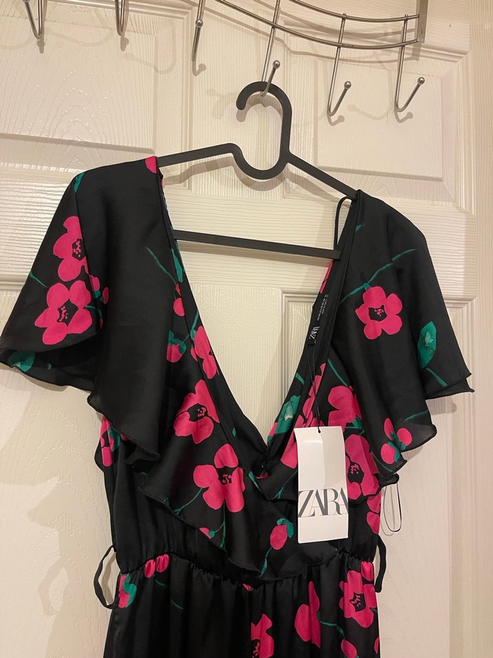 V yaka ve pembe çiçek desenli ve fırfır detaylı, sentetik kumaştan yapılmış salaş kadın tulumu. Romantik akşamlar için uygun.