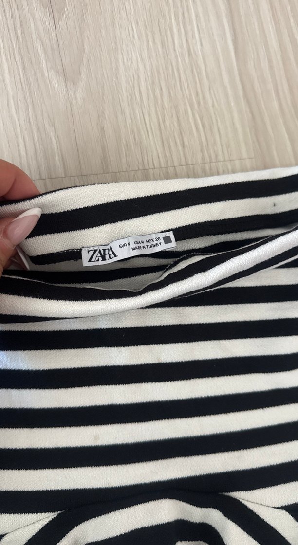 Zara markasına ait, çizgili desende ve fermuarlı detaylı, sentetik kumaştan yapılmış, normal midi boyda, vücuda oturan hamile eteği.