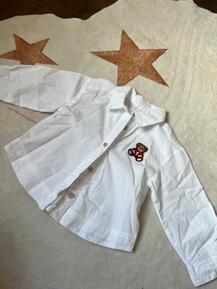 Pamuklu, bol kesim beyaz çocuk gömleği, uzun kollu ve düğmeli. Yakasında nakışlı ayıcık detayıyla sokak modasına uygun.Görseldede çektiğim gibi hafif boya lekesi mevcut