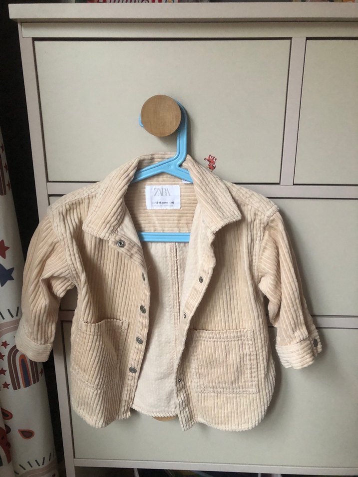 Bu bej kadife çocuk ceket, uzun kollu, ön cepli ve düğmeli kapamalıdır. Yumuşak dokusu konfor ve sıcaklık sağlar.