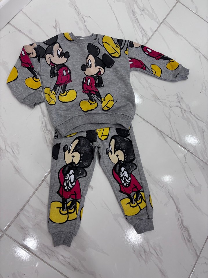 Gri renkli, örme kumaştan yapılmış, baskılı Mickey Mouse desenli, bol kesim erkek çocuk sweatshirt ve eşofman takımı. Yuvarlak yaka ve rahat sokak stili. Bir kez giyildi. Mickey sevmediği için giymedi