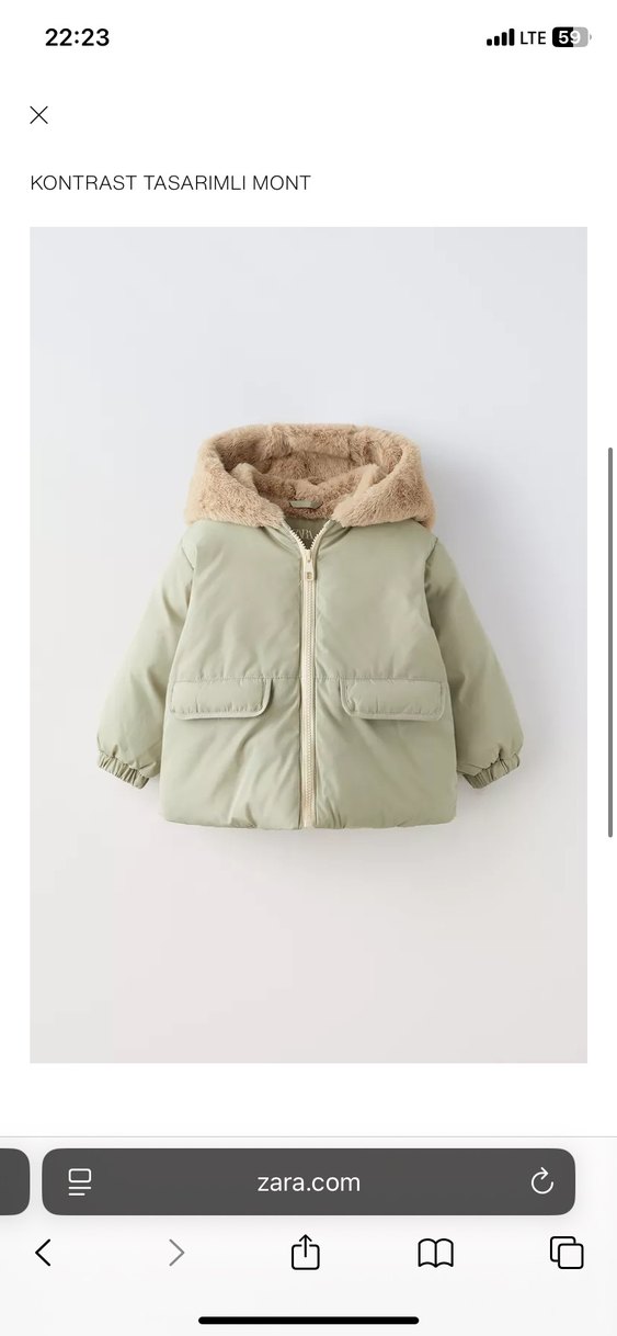 Pastel bej renkli, kapüşonlu çocuk montu. İç kısmı yumuşak ve sıcak kumaş, kapüşonunda kürk detaylıdır. Cep kapakları ve lastikli manşetlere sahiptir. Yağmur tutucu özelliğe sahiptir 1 sezon kullanıldı