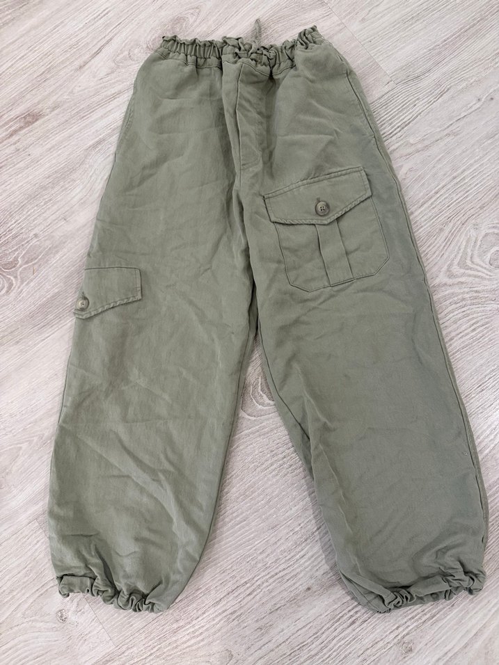 Gri tonlarında keten, düğmeli cepli, bol kesim erkek çocuk pantolonu, elastik bel ve paçalarla sokak stiline uygun.