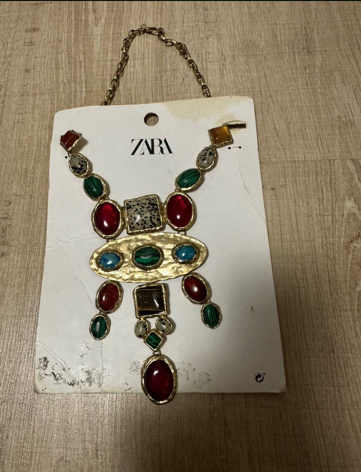 Zara markalı, çok renkli boncuklarla süslenmiş uzun bohem tarzda kolye. Günlük kullanıma uygun canlı ve koyu tonlarda desenli tasarım. Sıfır etiketli Zara Orjinal renkleri cok güsel dikkat çekici.