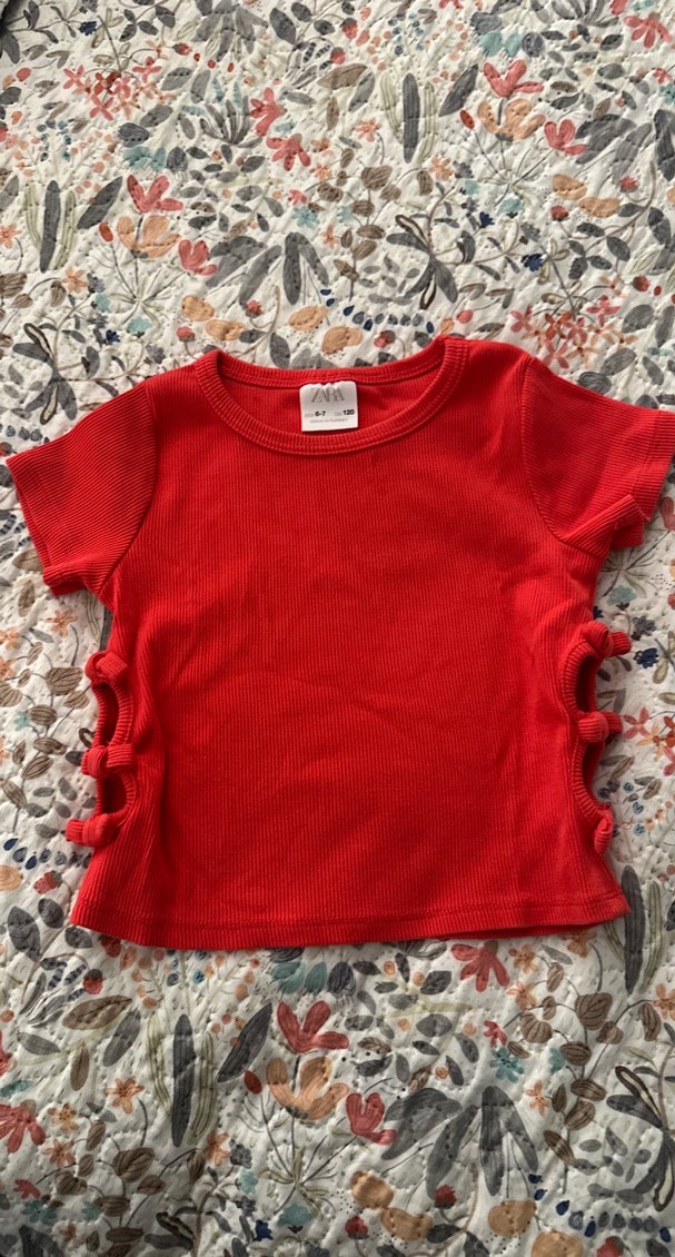 Kısa kollu, bisiklet yaka ve yanlarda fırfır detaylı kız çocuk kırmızı tişört. Yumuşak örme kumaştan, renkli sokak stili sunar.