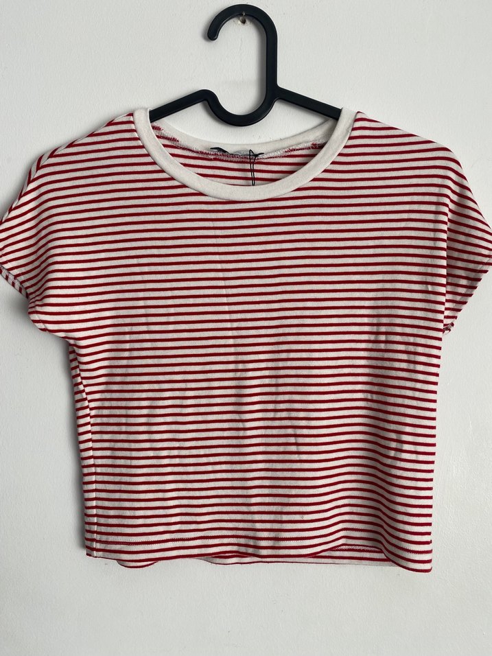 Az kullanildi, penye , kısa kollu kadın tişörtü, yuvarlak yaka ve kirmizi beyaz cizgili, günlük şıklık sunar.
