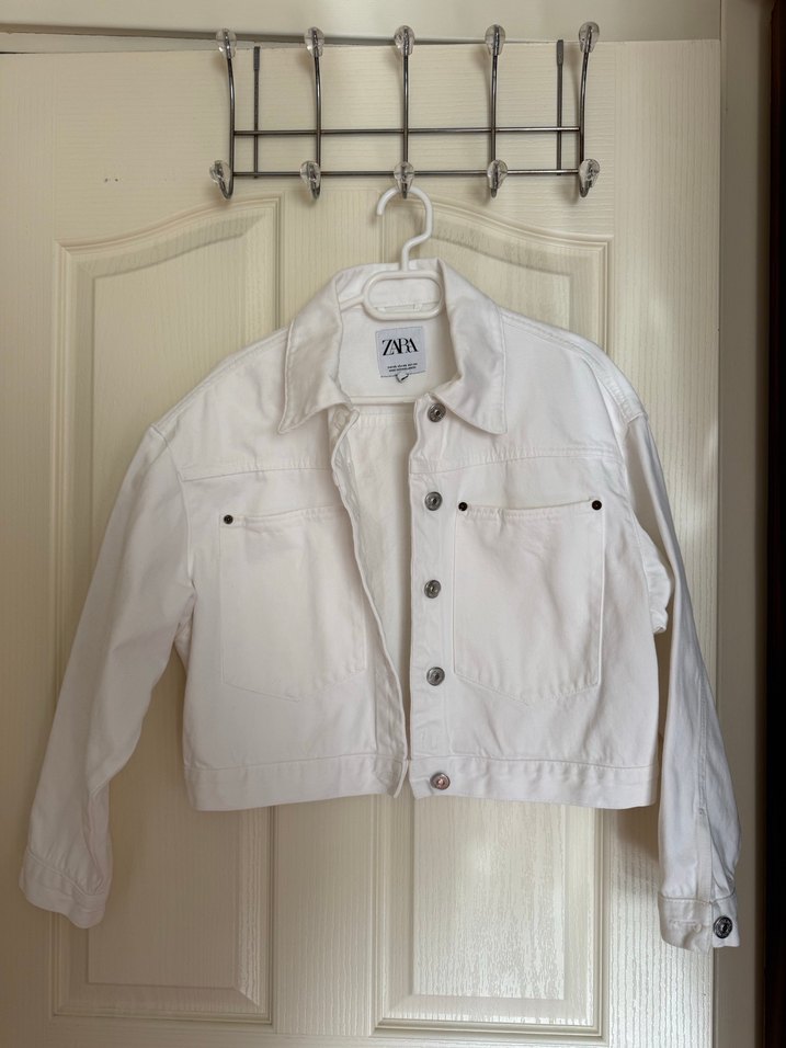 Beyaz renkte, düğmeli önü ve uzun kollu, rahat kesim denim ceket. cok az giyildi
