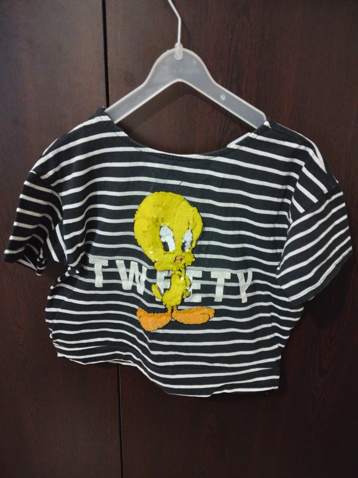 Zara crop tweety tshirt Looney Tunes lisanslı ürün 128 8yaş siyah beyaz çizgili, pul tweety işlemeli, çok iyi durumda