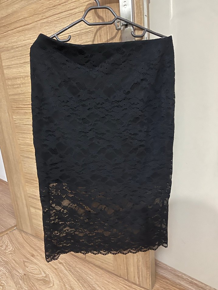 Dantel detaylı, siyah midi uzunlukta ve dar kesim etek. Sentetik kumaştan yapılmış, gotik tarzda, romantik akşamlar için uygun.