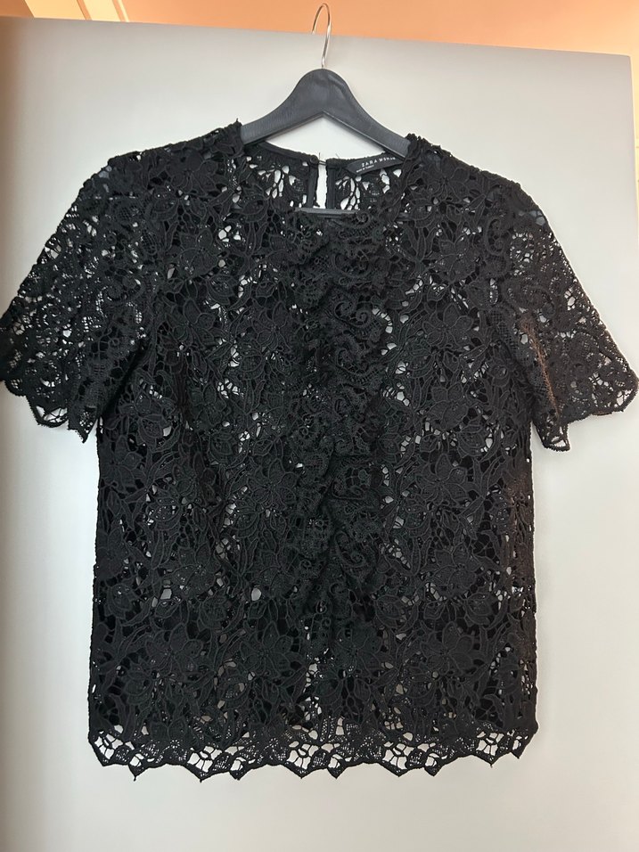 Zara Woman marka, 0 yaka dantel bluz, 34 beden ama geniş kalıp olduğu için M bedene uyar, kısa kollu, boyundan etek ucuna kadar fırfırlı, kumaş:viskoz, polyamid ve pamuk karışımı, kol boyu:23cm, kol altından göğüs çevresi:90cm, boy:52cm, boyun arkasından tek düğmeli, defosu yoktur #zara #siyah #dantel
