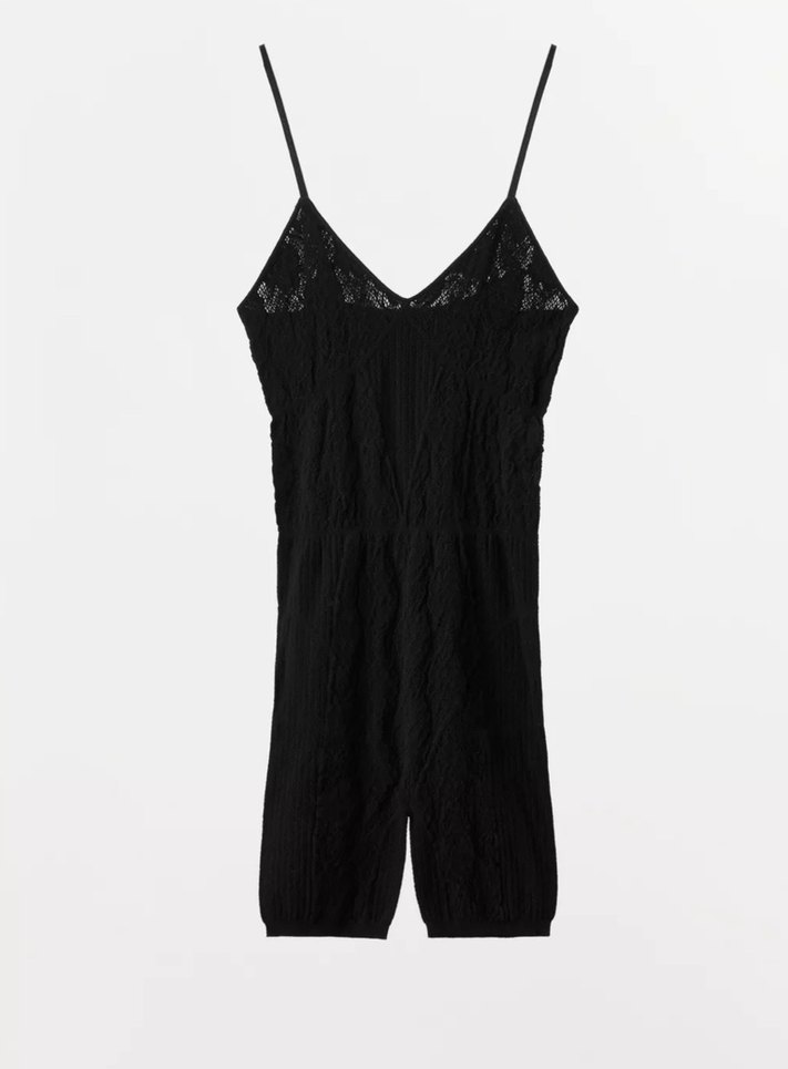 Siyah, dantelli ve strappy kollu, V yakalı, midi uzunlukta, dar kesim tulum. Minimalist gotik tarzda, örme kumaştan üretilmiştir. Günlük kullanıma uygundur.
