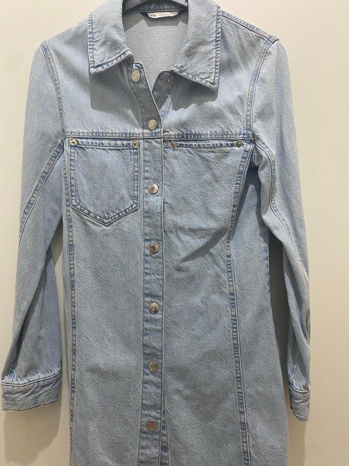 Zara denim elbise,ön kapama, uzun kollu ve yakalı tasarıma sahip günlük kadın denim ceketi. Normal midi boyda ve regular fit kesimdedir.