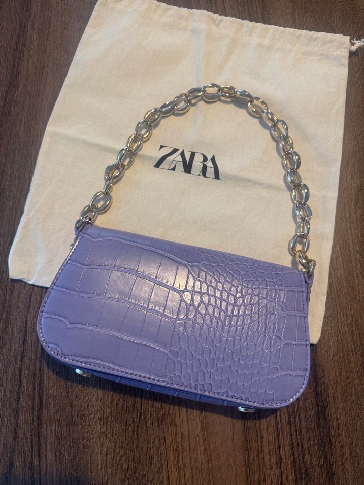 Lila-Mor deri kadın çanta, yılan desenli ve zincir detaylıdır. Zara markasına ait, modern klasik tarzda ve günlük kullanıma uygundur. Hiç kullanılmadı, hiçbir defosu yok, mağazadan alındığı haliyle duruyor, zara bez çantasıyla gönderilecektir.