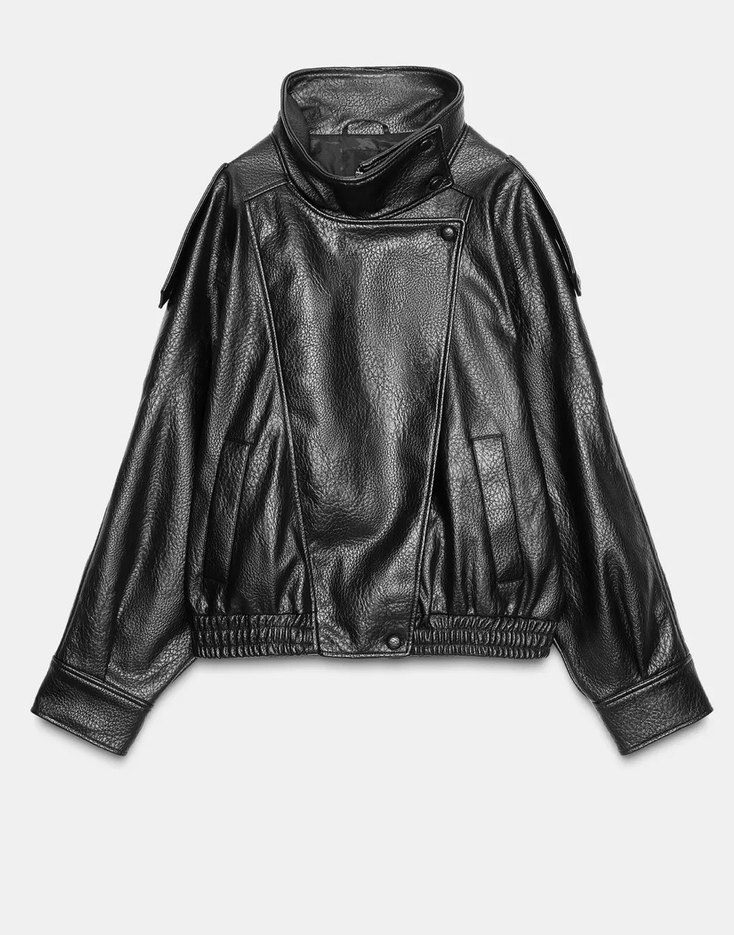 Yüksek yakalı, uzun askılı ve bol kesim siyah deri biker ceket. Bel detaylı, grunge punk tarzında, günlük kullanıma uygun.