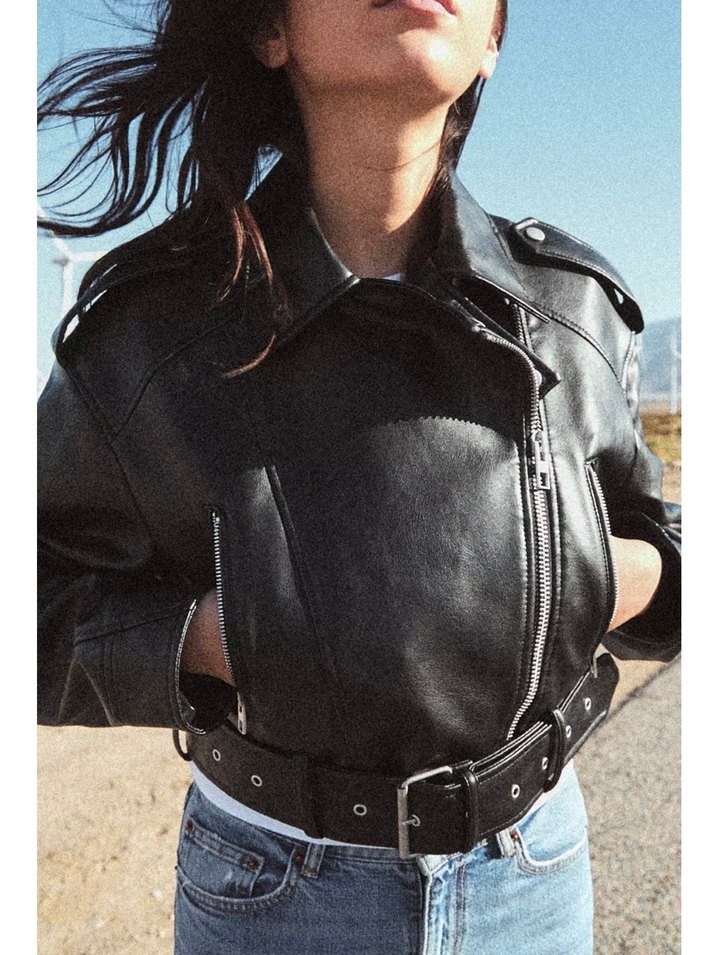 Siyah deri biker ceket, yakalı, tokalı ve askılı kollu detaylara sahiptir. Normal boyda ve rahat kesimdir, günlük kullanım için uygundur.