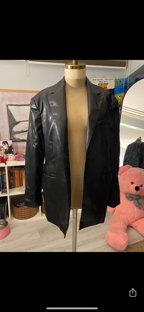 Düğmeli, siyah deri kadın ceket, keskin yaka ve midi boyda, ofis ve günlük sokak modasına uygundur ✨