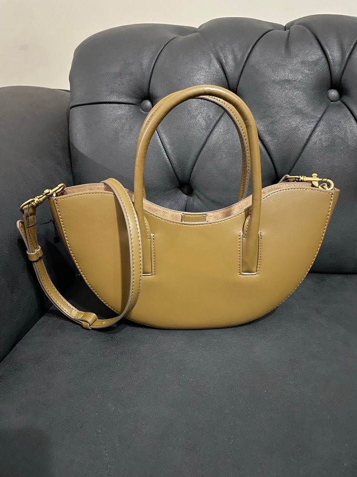 Bej renkte deri, kemerli tasarıma sahip kadın çantası. Minimalist ve çağdaş stilde, pastel tonlarda, desen içermeyen günlük kullanıma uygun bir çanta.